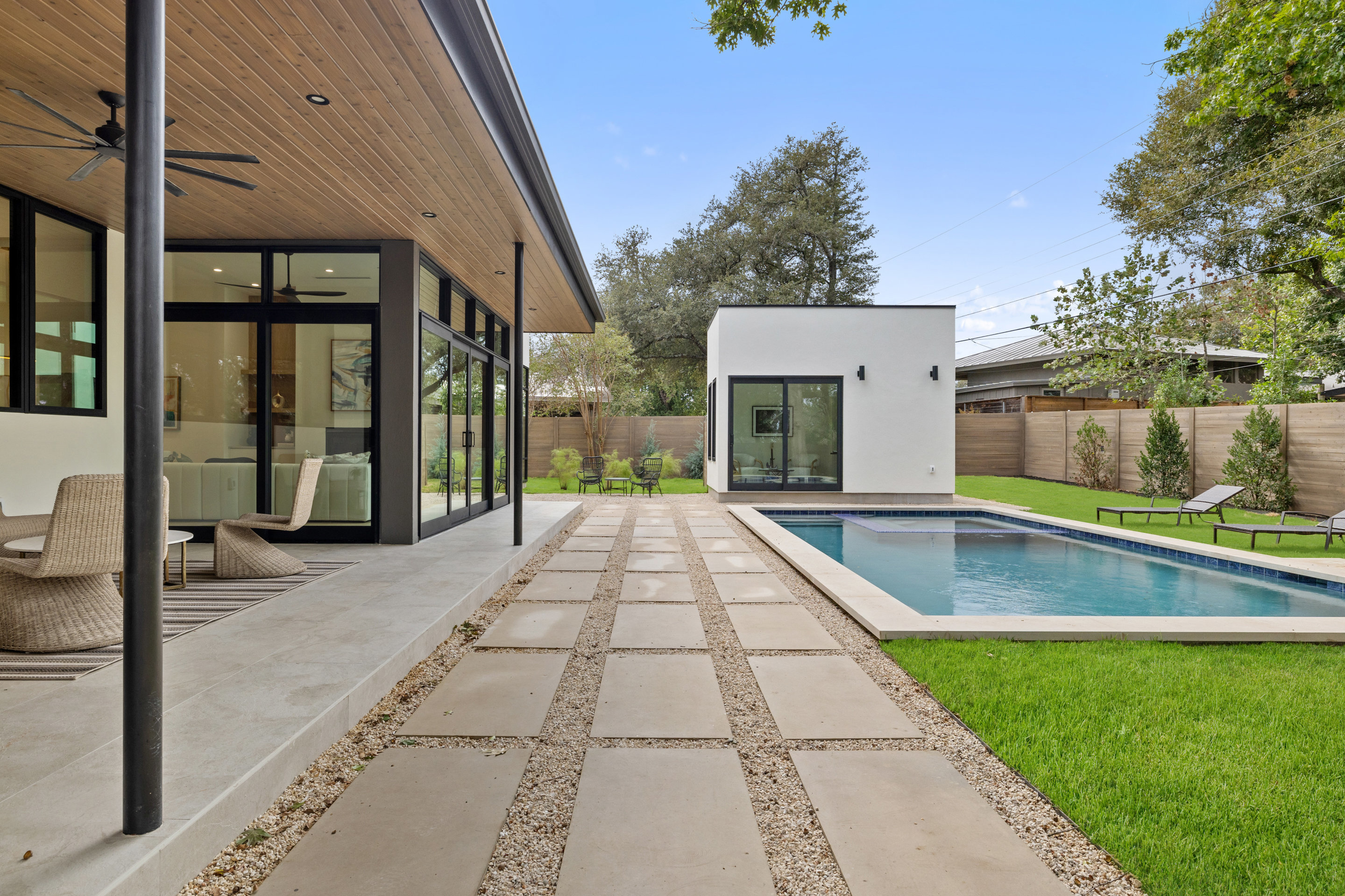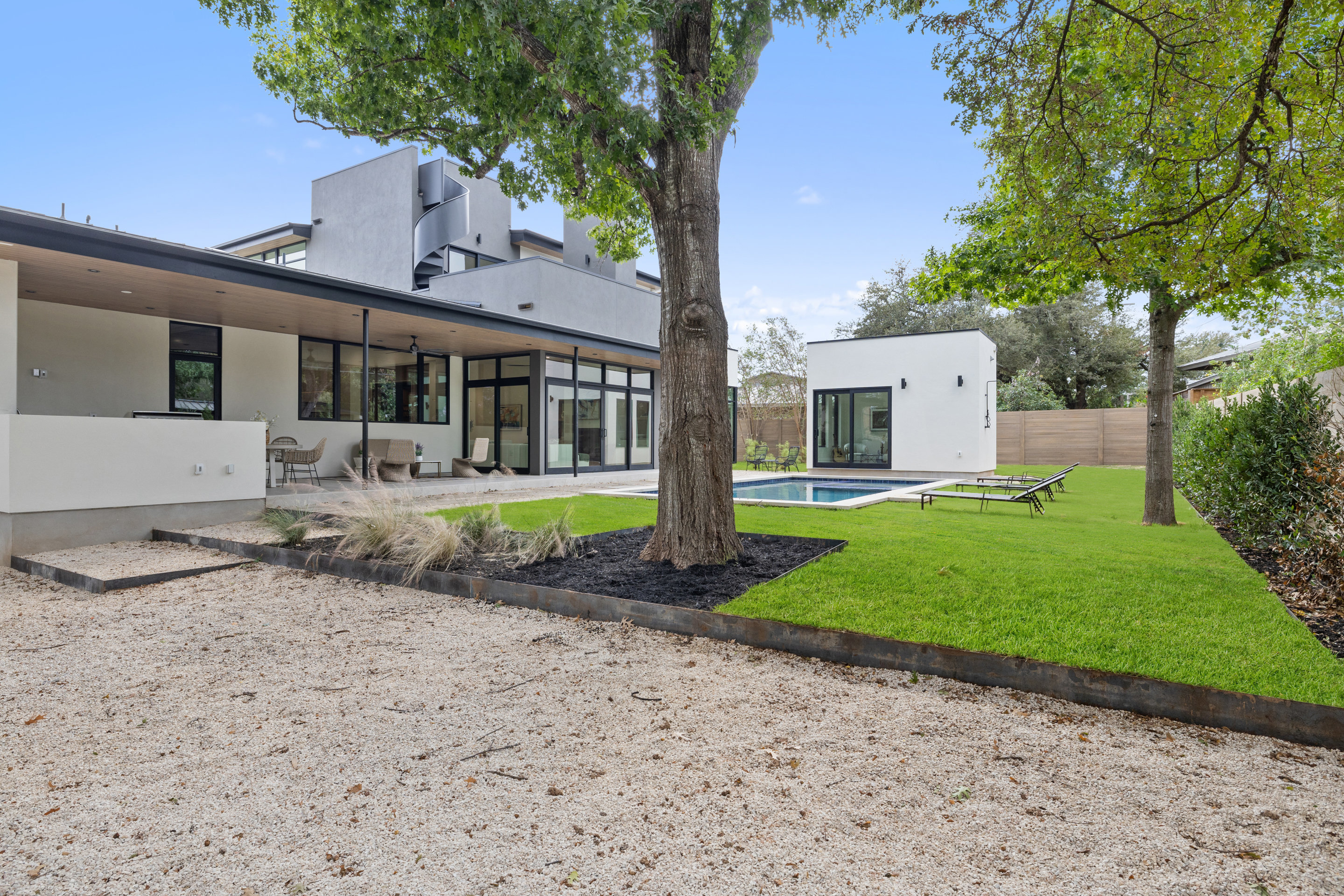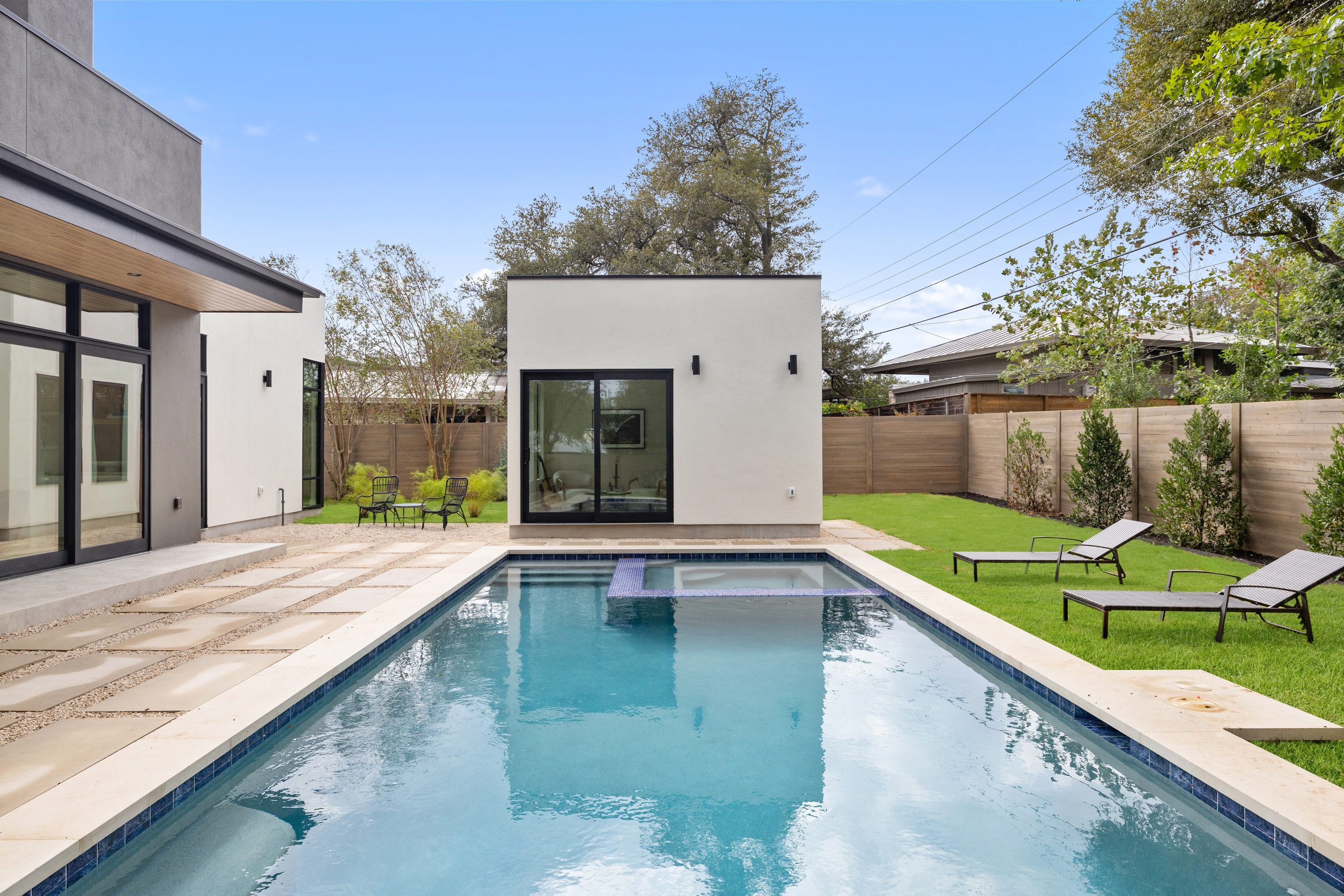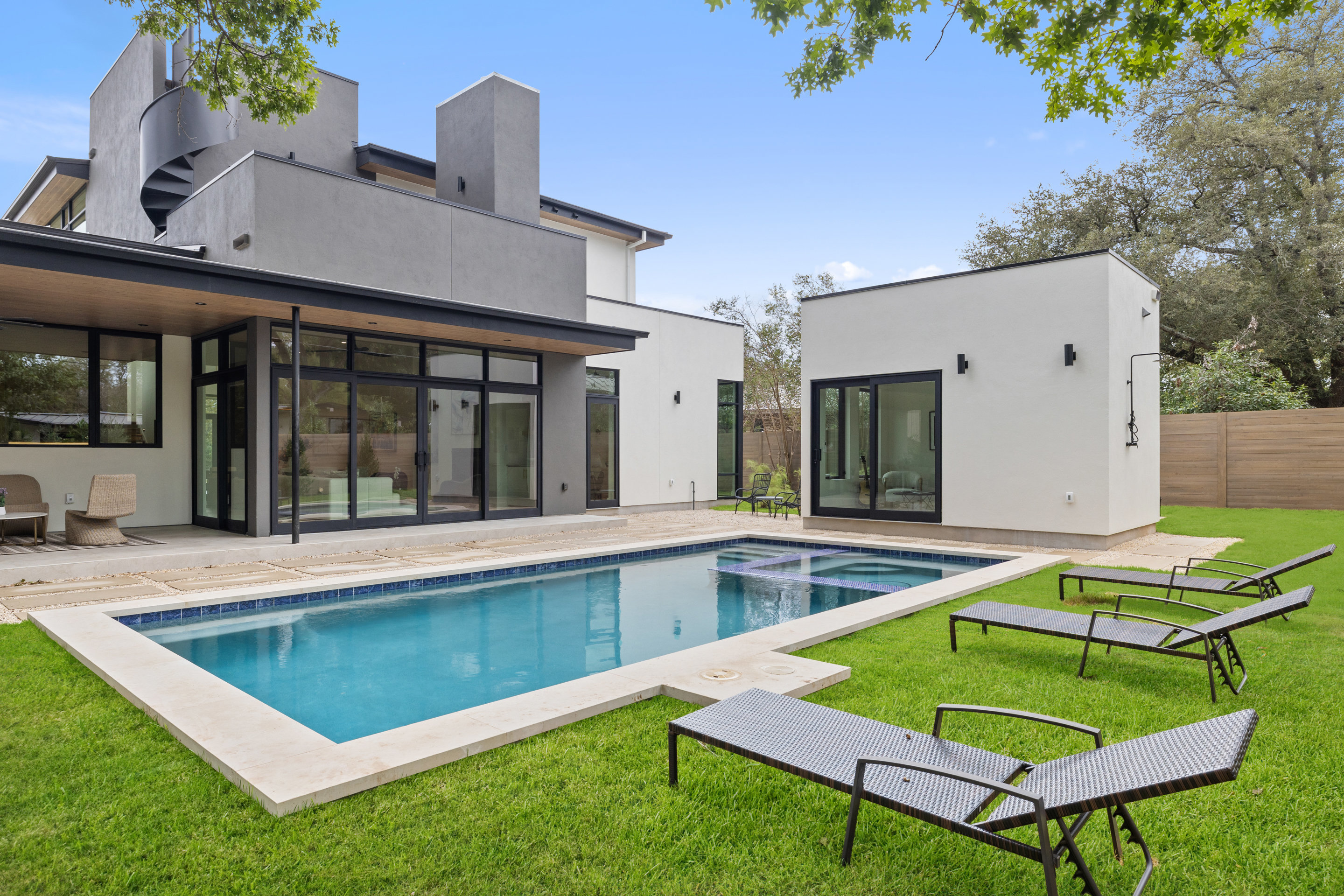 Modern luxury newer construction (2024) in Westlake's most convenient and walkable neighborhood - “Westwood”. Walking/biking distance to exemplary Eanes ISD public schools and many nearby private schools, shopping, coffee shops and restaurants, yet just a 5-10 minute drive to DT Austin, Lady Bird Lake, SoCo, etc. Warm transitional style features and finishes throughout, every space has been crafted to maximize comfort, luxury, and privacy. Featuring 4600 sq. ft. with 5 bedrooms including the primary suite, guest suite + study + bar and abundant storage on the main level. 3 additional bedrooms all with en-suite baths and a den/media room upstairs and a small office/homework space with custom built-ins. Tall ceilings and great flow throughout. The oversized kitchen features custom White Oak cabinetry; Thermador professional appliances and a view to the pool, spa and backyard space. The kitchen also features an impressive large island with seating area and is connected to a functional butler pantry including extra storage and prep space, additional fridge and a 2nd dishwasher. Accessible from both the main family room and the butler pantry, the generous main level covered patio features a BBQ area; additional 2nd floor deck and 3rd floor rooftop terrace overlooking DT Austin and the city lights. Separate casita/guest house adjacent to pool includes bathroom and could be a great art, music, reading, or hobby room. Custom Audio/Visual/Security and Camera package has been installed and is included with the home. Westwood features one of Travis County’s lowest tax rates at 1.46% which is lower than nearby Rollingwood and West Lake Hills and considerably lower than nearby City of Austin properties.